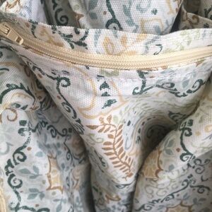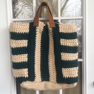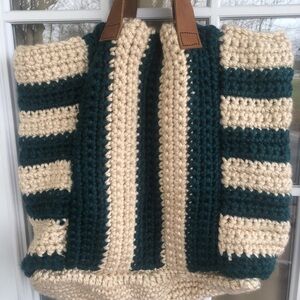 This is an awesome, possibly hand knitted striped large bag with coordinating lining and leather handle. It appears to be made by someone, which makes this cutie a one of a kind. One large inner pocket with a small zipped pocket as well. Seems sturdy and made well. Measures 24” wide, 16” tall.