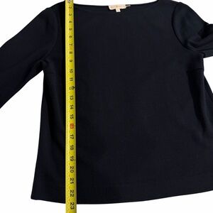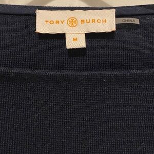 Tory Burch elegant Wool Blend Embellished Sweater in Dark Navy (looks Black) with Floral Beaded Applique.