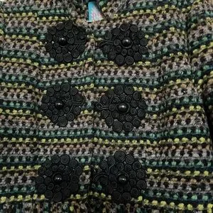 Chic cape with a striped pattern. Features green and black hues. Elegant floral accents on the front. Perfect for stylish layering. Very nice and soft coat in good condition no peeling. Not my size anymore