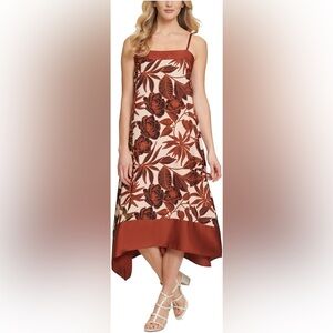 DKNY Brown Floral Midi Dress NWT Large Square Neck Spaghetti Strap Flowy Shift