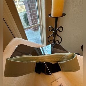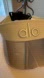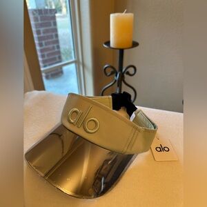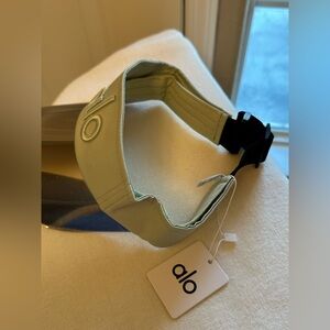 Brand new Alo Yoga visor in a soft green tone with tags still attached and the original protective film on the visor. Sleek, modern design with embroidered ALO logo and a tinted visor for sun protection.