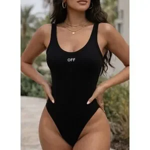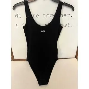 Keywords: off white bodysuit, ribbed tank, black bodysuit, designer bodysuit, high cut, scoop neck, logo detail, streetwear, layering piece, night out, casual style, fashion staple