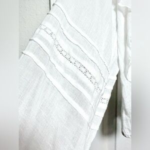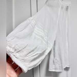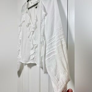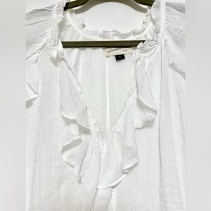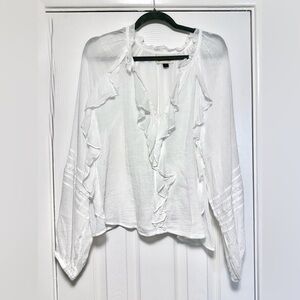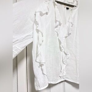 Elegant white blouse with ruffle accents. Flowy and fashionable. Perfect for any occasion. Lightweight and very chic. NWOT Size M