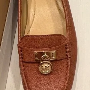 Chic tan loafers with signature MK charm. Sleek leather design. Ideal for versatile wear.