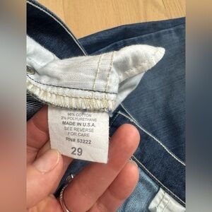 David Kahn dark-wash flare jeans with stretch denim. Classic five-pocket style, made in the USA. Natural fading, great condition.
