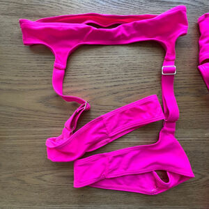 This listing features a new, without tags or box, bright pink women's three-piece swimsuit. The set includes a one-shoulder top with cut-out detail, a high-cut bottom, and a separate waist-cinching band. The material is 80% Polyamide and 20% Elastane, size M. The swimsuit shows no visible imperfections. Measurements are not provided. Brand and model information are unavailable.