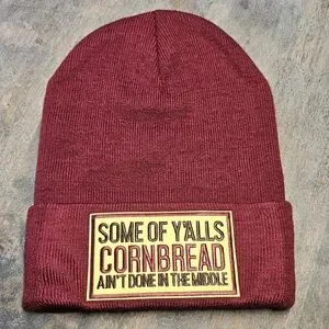 brick red Soft knit beanie featuring a humorous cornbread patch. Perfect for adding a fun touch to your outfit.