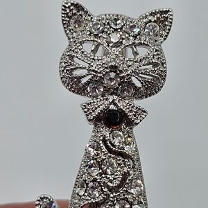Vintage cat hair clip. Covered in clear pave rhinestones with a single dark red accent on collar. Alligator clip back. Measures about 1.75" long. Part of an estate collection and no visible maker's mark. Excellent condition and smoke-free home.
