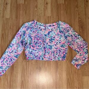 Vibrant crop top with long sleeves. Features a lively blue and pink pattern. Perfect for a stylish look.