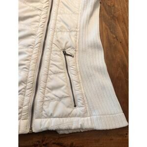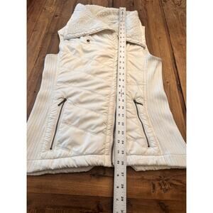 The Prana Diva Vest is a stylish women's size small quilted vest with an asymmetric zipper and sherpa lining for added warmth. Made of polyester with a high neck design, this ivory vest is perfect for adding a touch of sophistication to any outfit. The brand prAna is known for its quality and sustainable outdoor clothing, making this vest a great choice for the colder months.
