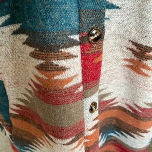 Stylish button-up jacket with a vibrant pattern. Features shades of gray, blue, red, and brown.