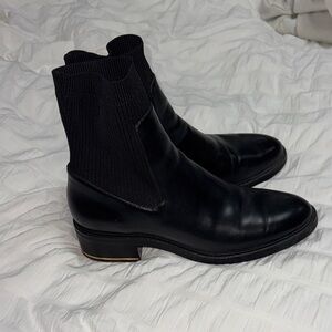 Zara black leather boots with ribbed knit detail. Sleek design with a comfortable fit. Ideal for stylish outings