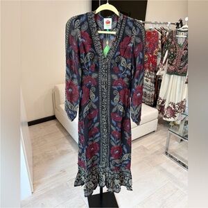 The Black Valentina Ruffled Long Sleeve Midi Dress enchants with its flowing silhouette and gentle ruffle trims that frame a flattering V neckline. Its sheer long sleeves add an airy, delicate touch, while the rich black fabric blooms with bold red and soft blue floral patterns intertwined with elegant paisley motifs. A playful frilled hem anchors the look, inviting warmth and effortless charm into every moment.