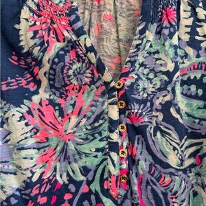 Chic sleeveless tank with vibrant floral/firework pattern. Features blue and pink hues. Perfect for patriotic outings. Gold buttons and smocking at neck. Only worn a couple of times.
