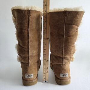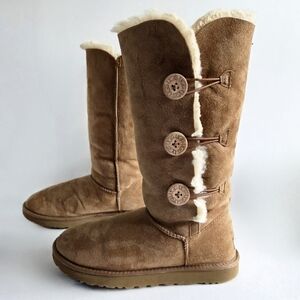 UGG Australia Tall Bailey Button boots in Chestnut. Triple wood button closure, sheepskin lining, suede exterior. These boots are designed for comfort and warmth, and are generally considered "classic" UGGs rather than the newer "II" versions. Size 10, shaft height in photos. There are a few very small dots (circled in pic 12). Otherwise these super cute & comfy boots are in great condition.