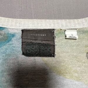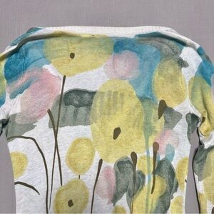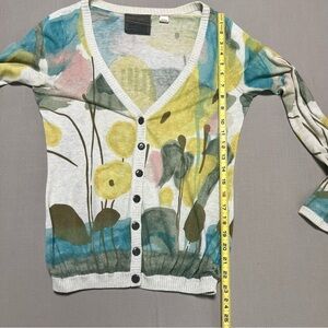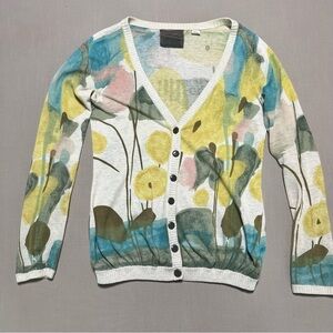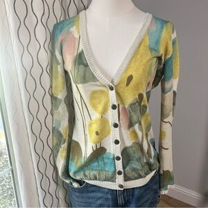 Beautiful Anthropologie Guinevere cardigan sweater in size XS. Features a soft knit with a painterly watercolor floral design in yellow, green, teal, and blush tones on a neutral base. Designed with a deep V-neckline, button front closure, and ribbed trim at the cuffs and hem. Lightweight and versatile, this sweater is perfect for layering over a cami, tee, or dress. A rare and eye-catching Anthropologie piece that blends artsy style with everyday wear.