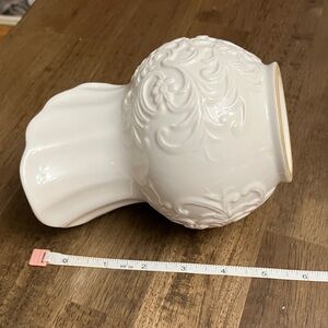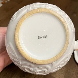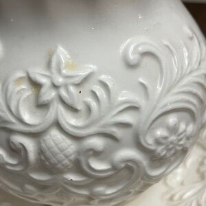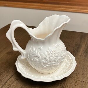 Beautifully crafted white ceramic pitcher with matching bowl. Intricate embossed design adds a touch of elegance.