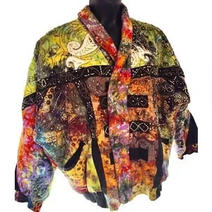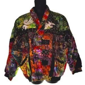 OMG stunning beaded batik handmade 100% cotton jacket made in Indonesia. Colorful, happy, Boho, hippy, vintage 1980's, imported, fantastic. Built like a bomber jacket zips closed with Velcro fasteners. Warm and comfortable. Dry clean only! Size 2X ❤️.