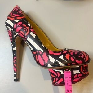 NWOT Charlotte Olympia floral design platform heels with striking black and pink colors. Perfect for making a statement. Elegant and stylish.