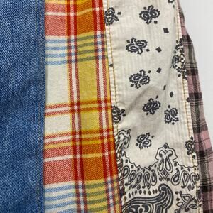 Super neat flare jeans. Bandana, floral, butterfly, and plaid print mixed patchwork design. 4-Button fly. Two back pockets that are still stitched closed. Great for concerts, festivals, or everyday casual wear!