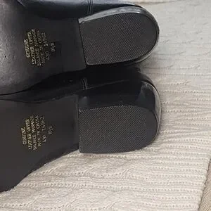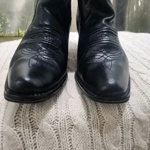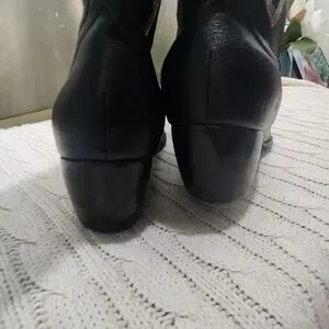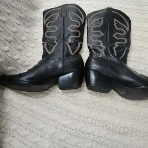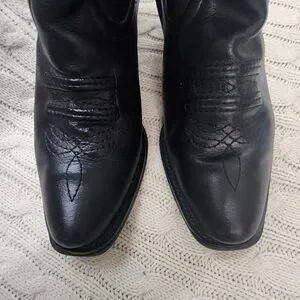 Sleek black leather boots with unique stitching. Ideal for a standout style.