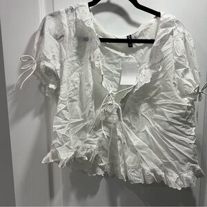 Elegant white women's top featuring delicate lace trim and tie details. Perfect for a chic and stylish look.