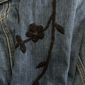 Chic blue denim jacket with striking black embroidery. Ideal for casual elegance.