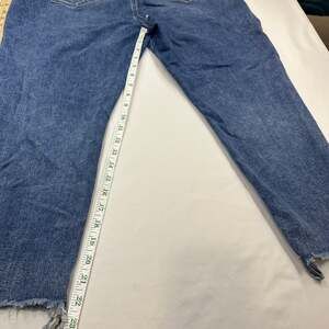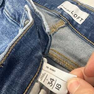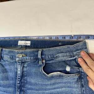 LOFT The Skinny High-Rise Stretch Jeans, Petite Size 18 / 34, Light Wash Raw Hem. Features a high-waisted fit, raw-edge hem, and moderate stretch for comfort. Light distressing adds a casual, lived-in feel. Good pre-owned condition with no significant flaws. Measurements shown in photos: approx 18-inch waist laying flat and 23-inch inseam. Perfect for everyday wear or casual weekends.