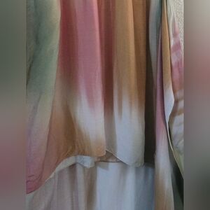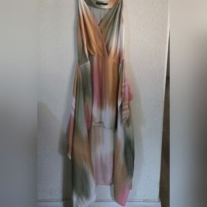 Embrace elegance with this chic asymmetrical dress, featuring a beautiful blend of pastel pink, green, and orange. Perfect for any occasion, its unique design and soft colors add a touch of sophistication to your wardrobe. Good condition.No stains, no rips. Beautiful style.