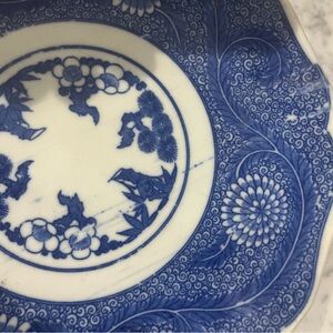 Vintage Japanese blue and white Imari porcelain plate or charger with a scalloped edge and a central roundel featuring a bird and floral motif.