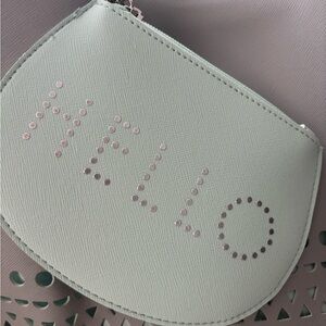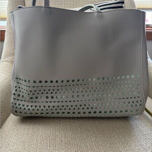 Gray tote bag with a mint lining and HELLO pouch. Pouch can detach and be used as a wallet or mini cosmetic bag. HELLO has mini rhinestones that spell out the word. Perfect for everyday use. Features an eyelet design with the mint lining showing through. Perfect for the beach or overnight stays.