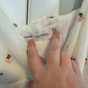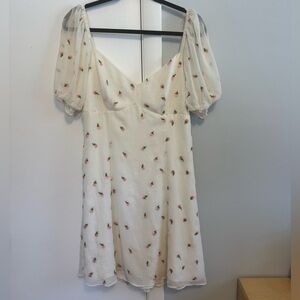 Chic mini dress with puff sleeves. Cottagecore. Features delicate floral design. Ideal for stylish outings.