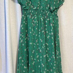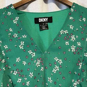 DKNY green Floral dress features soft flutter sleeves and a smocked waist. Dress is 100% Polyester and fully lined.