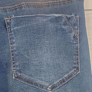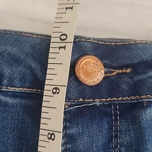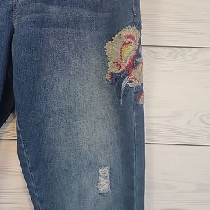 A soft cotton blend blue denim jeans by Royalty for Me with embroidered floral patches, a straight leg, and manufacture distressing, including fading, whiskering, and tears. Great pre-owned condition