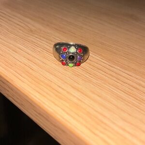 This is a vintage multi-stone sterling silver dome ring featuring turquoise, coral, gaspeite, and onyx