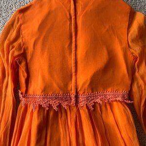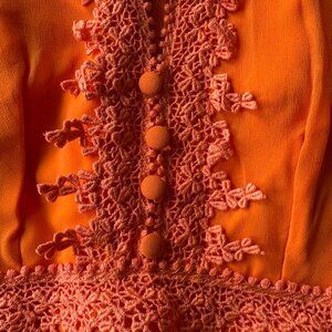 Step into the 1970s with this vibrant vintage orange prairie dress! Featuring delicate lace detailing, a romantic keyhole neckline, and sheer long sleeves, this dress captures timeless boho festival vibes.