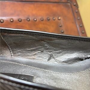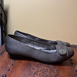 Cute flats with herringbone pattern, polished cap tie, and decorative button embellishment. Pewter color. Some light flaking on lining (see picture).