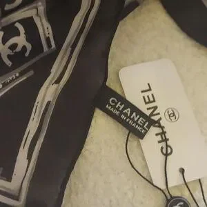 Elegant CHANEL scarf with iconic logo pattern. Black and gray design. Perfect for any occasion.