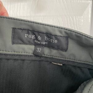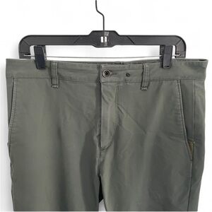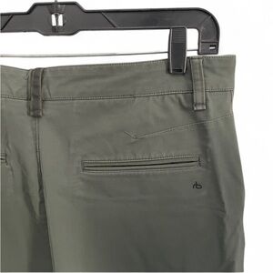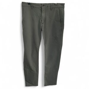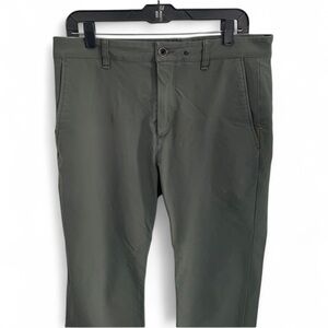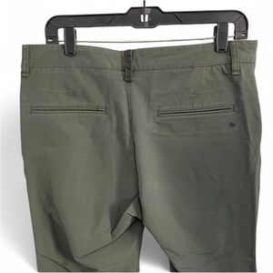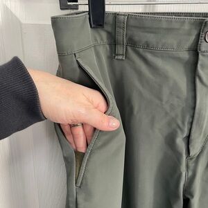 Straight legged green pants with deep front pockets and back pockets. Swishy pant-feel which makes me feel like these are stain resistant? Extremely comfortable! Great work trouser since they look professional but are comfy.