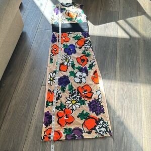 This 70s, mock neck tank dress, zips up the back, with striking floral pattern and open sides at the hip, down. Meant to be worn over a pant or legging.