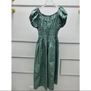 Chic green dress with puff sleeves. Features a gathered waist and tie detail.