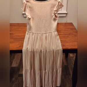 Style: It is a casual, flowy midi dress. The tiered, A-line skirt gives it a relaxed, effortless look.