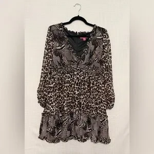 Betsey Johnson Leopard Zebra Print Ruffle Babydoll Dress Sheer Sleeve Sz 12
