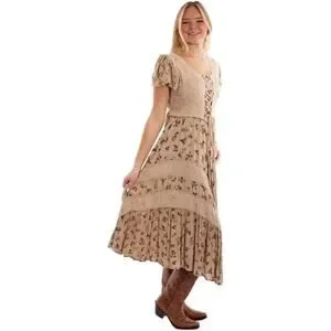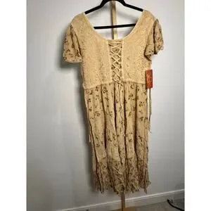 Year around boho style, midi-length lace-up front cap sleeves dress. Features panels of solid fabric and rose print adorned by soutache and embroidery throughout. Front features a lace up tie. Tie back creates a perfect cinched fit. Cap sleeves are finished with a delicate crochet trim and the scoop neck is a flattering look.
