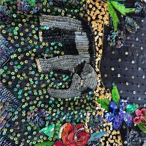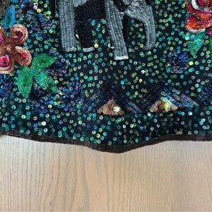 Black tank top with shimmering sequins. Features colorful floral and animal embroidery. Perfect for standout style.