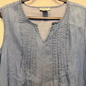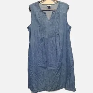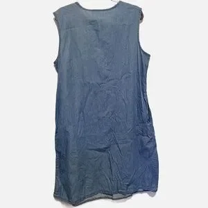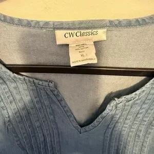 This is a gently used lightweight 100% cotton Cw Classics jumper dress. it has v neck, flat pleated bodice and front hand pockets. Cute to wear on its own for spring/summer or would look cute with a shirt under it as well. Size XL and measures 23" pit to pit and 40" long shoulder to hem. #cwclassicsdress #sleevelesschambray #jeandress #denimdress #denimjumperdress