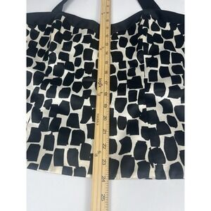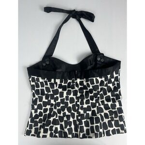 The White House Black Market Corset Removable Halter Silk Top in size 14 is a stylish and elegant blouse perfect for formal occasions. The sleeveless design with a halter neckline and geometric black and white pattern adds a touch of sophistication. Made from luxurious silk satin, this slim-fit cropped top features a full zip closure and is lined for added comfort. It is versatile enough to be worn in the summer, fall, or spring, making it a classic wardrobe staple for any fashion-forward woman.