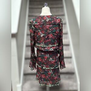 anthropologie scotch soda jardin apus boho chic floral chiffon leopard neckline cottagecore feminine fall fashion winter outfit holiday party brunch style artistic print boutique designer mini romantic aesthetic layered look statement dress ruffle trim sheer sleeve mixed pattern festival vibe whimsical trendy womenswear unique piece soft drape lightweight viscose lined silhouette wearable art quiet luxury