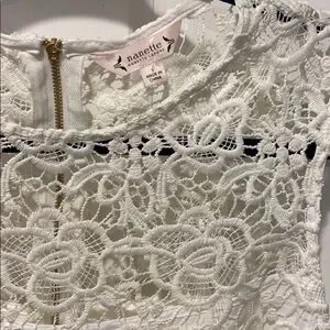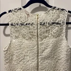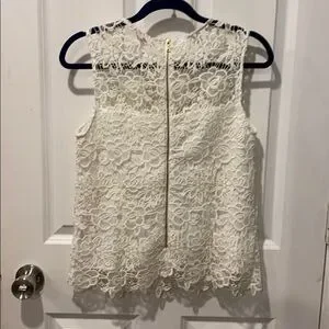 Excellent condition from smoke free owner! White lace sleeveless blouse from Nanette Lepore. Lined to hide your bra, peekaboo lace at shoulders and hem. Exposed gold zip close in back. Gorgeous on its own, or wear with a jacket or blazer. Size small and true to size.