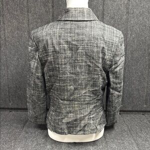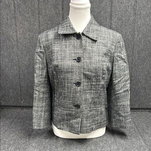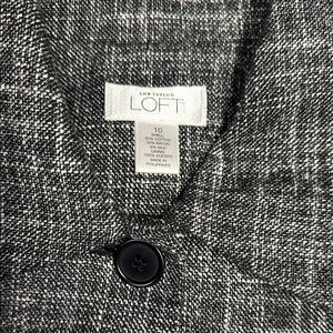 This LOFT blazer in a sophisticated gray hue showcases a tailored silhouette with a textured fabric, ideal for professional and smart casual settings. Its structured design and monochromatic tones offer a refined and polished look.